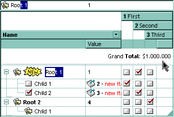 A locked or fixed item is always displayed on the top or bottom side of the control no matter if the control's list is scrolled up or down. A locked item is not selectable. Use the LockedItem property to access a locked item by its position. Use the LockedItemCount property to add or remove items fixed/locked to the top or bottom side of the control. Use the ShowLockedItems property to show or hide the locked items. Use the IsItemLocked property to check whether an item is locked or unlocked. Use the CellCaption property to specify the caption for a cell. Use the SelectableItem property to indicate whether the item is selectable.