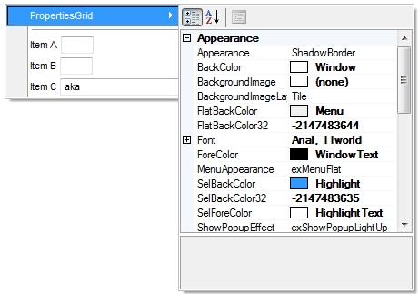 The following screen shot shows the eXContextMenu/NET that hosts a PropertyGrid control: