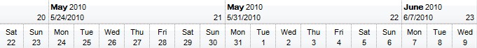 With Gantt1 .BeginUpdate .Font.Name = "Arial Unicode MS" .HeaderHeight = 36 With .Chart .FirstVisibleDate = #5/30/2010# .PaneWidth(False) = 0 .FirstWeekDay = 1 .UnitWidth = 36 .LevelCount = 2 With .Level(0) .Label = "<b><%loc_mmmm%></b> <%yyyy%><br><%loc_sdate%><r> <%ww%> " .ToolTip = .Label .Unit = 256 End With With .Level(1) .Label = "<%loc_ddd%><br><%d%>" .ToolTip = .Label End With .ToolTip = "<%loc_ldate%>" End With .EndUpdate End WithThe following VB6 sample shows how to specify the levels using the user's Regional and Language Options?