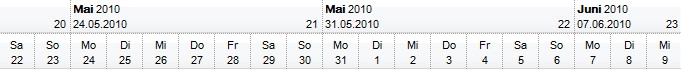With Gantt1 .BeginUpdate .Font.Name = "Arial Unicode MS" .HeaderHeight = 36 With .Chart .FirstVisibleDate = #5/30/2010# .PaneWidth(False) = 0 .FirstWeekDay = exMonday .UnitWidth = 36 .LevelCount = 2 With .Level(0) .Label = "<b><%loc_mmmm%></b> <%yyyy%><br><%loc_sdate%><r> <%ww%> " .ToolTip = .Label .Unit = exWeek End With With .Level(1) .Label = "<%loc_ddd%><br><%d%>" .ToolTip = .Label End With .ToolTip = "<%loc_ldate%>" End With .EndUpdate End WithThe following VB.NET sample shows how to specify the levels using the user's Regional and Language Options?