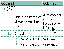 With Gantt1.BeginUpdate .ColumnAutoResize = True .LinesAtRoot = exLinesAtRoot .FullRowSelect = False .MarkSearchColumn = False .Columns.Add "Default" With .Items Dim h As HITEM, hx As HITEM h = .InsertItem(, , "Root") hx = .InsertItem(h, , "This is an item that should break the line") .CellSingleLine(hx, 0) = False h = .InsertItem(h, , "Child 2") .InsertItem h, , "SubChild 2.1" h = .InsertItem(h, , "SubChild 2.2") End With .EndUpdate End With
