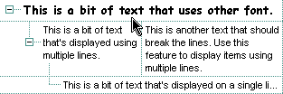 By default, the ItemFont property is nothing. If the ItemFont property is nothing, the item uses the control's font. Use the ItemFont property to define a different font for the item. Use the CellFont and ItemFont properties to specify different fonts for cells or items. Use the CellBold, CellItalic, CellUnderline, CellStrikeout, ItemBold, ItemUnderline, ItemStrikeout, ItemItalic or CellCaptionFormat to specify different font attributes. Use the ItemHeight property to specify the height of the item. Use the Refresh method to refresh the control's content on the fly. Use the BeginUpdate and EndUpdate methods if you are doing multiple changes, so no need for an update each time a change is done.
