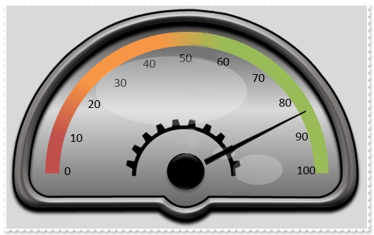 axGauge1.BeginUpdate(); axGauge1.set_DefaultLayer(EXGAUGELib.DefaultLayerPropertyEnum.exDefLayerRotateType,2); axGauge1.BackColor = Color.FromArgb(217,217,217); axGauge1.PicturesPath = "C:\\Program Files\\Exontrol\\ExGauge\\Sample\\Design\\Circular\\Guage"; EXGAUGELib.Layer var_Layer = axGauge1.Layers.Add("background"); var_Layer.Background.Picture.Name = "Guage_Background.png"; var_Layer.RotateCenterY = "lheight/2 + 78"; EXGAUGELib.Layer var_Layer1 = axGauge1.Layers.Add("needle"); var_Layer1.Background.Picture.Name = "Guage_Needle.png"; var_Layer1.OnDrag = EXGAUGELib.OnDragLayerEnum.exDoRotate; var_Layer1.RotateAngleValid = "value < 90 ? value : (value < 180 ? 90 : ( value < 270 ? 270 : value ))"; var_Layer1.RotateAngleToValue = "value >= 270 ? (value - 270)/90*50 : (value/90)*50 + 50"; var_Layer1.ValueToRotateAngle = "value < 50 ? (270 + value/50*90) : (value - 50)/50 * 90"; axGauge1.Value = 85; axGauge1.EndUpdate();