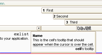 Use the ToolTipWidth property to change the tooltip window width. The height of the tooltip window is automatically computed based on tooltip's description. The ToolTipPopDelay property specifies the period in ms of time the ToolTip remains visible if the mouse pointer is stationary within a control. The ToolTipDelay property specifies the time in ms that passes before the ToolTip appears. Use the ToolTipFont property to assign a font for the control's tooltip. Use the Background(exToolTipAppearance) property indicates the visual appearance of the borders of the tooltips. Use the Background(exToolTipBackColor) property indicates the tooltip's background color. Use the Background(exToolTipForeColor) property indicates the tooltip's foreground color. Use the CellToolTip property to specify the cell's tooltip. Use the ShowToolTip method to display a custom tooltip.