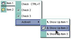 By default, the OpenMode property is Vertical . If the OpenMode property is Vertical, the items in the menu bar are arranged from top to bottom, line by line, one item per line. If the OpenMode property is Horizontal the items of the menu bar are arranged from left to right. The menu bar is displayed always in the form. Use the Appearance property to specify the control's appearance. Use the Font property to specify the control's font. Use the BackColor property to specify the control's background color. Use the ForeColor property to specify the control's foreground color. The OpenOnClick property specifies whether the sub menu is opened when the user clicks the item in the menu bar.