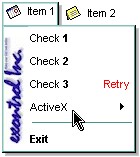 Use the Picture property to put a picture on the menu's background. Use the PictureDisplay property to align picture on the menu's background. Use the Picture property to display a picture on the control's background. Use the BackColor property to specify the item's background color. Use the ForeColor property to specify the item's foreground color. Use the Caption property to specify the caption of the item. Use the Picture property to specify a picture on the control's background ( menu bar ). Use the PopupBackColor property to change the background color for the popup menu.