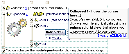 Use the ToolTipWidth property to change the tooltip window width. The height of the tooltip window is automatically computed based on tooltip's description. The ToolTipPopDelay property specifies the period in ms of time the ToolTip remains visible if the mouse pointer is stationary within a control. The ToolTipDelay property specifies the time in ms that passes before the ToolTip appears. Use the ToolTipFont property to assign a font for the control's tooltip. Use the Background(exToolTipAppearance) property indicates the visual appearance of the borders of the tooltips. Use the Background(exToolTipBackColor) property indicates the tooltip's background color. Use the Background(exToolTipForeColor) property indicates the tooltip's foreground color. Use the ShowToolTip method to display a custom tooltip.