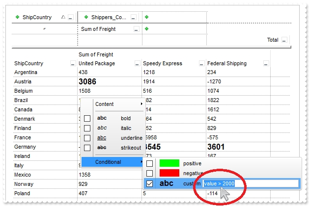 with Pivot1 do begin BeginUpdate(); Import('C:\Program Files\Exontrol\ExPivot\Sample\data.txt',Null); with FormatConditionalAppearances.Add('custom','custom','') do begin Bold := True; FontSize := 12; Expression := 'value > 2000'; ContextEditExpression := True; end; PivotRows := '0'; PivotColumns := 'sum(5)[custom]/12'; EndUpdate(); end
