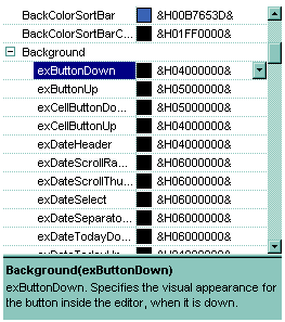 For instance, let's say that we browse the eXGrid control that includes the "property Grid.Background(Part as BackgroundPartEnum) as Color. The property returns or sets a value that indicates the background color for parts in the control.". The Background property has a single parameter of BackgroundPartEnum type ( enumeration type ). The Background property retrieves different values based on the Part parameter. The Part parameter is of BackgroundPartEnum type. When the control includes the Background property, it combines all parameters with their values, and add a new property for each, as seen bellow.