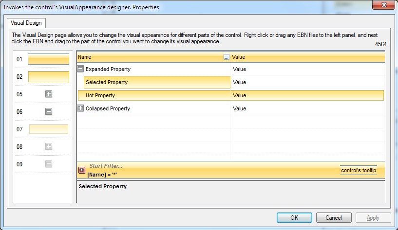 The following picture shows the control's VisualDesign form after applying some EBN objects: