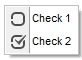 With Exribbon1 With .VisualAppearance .Add(1,"c:\exontrol\images\normal.ebn") .Add(2,"c:\exontrol\images\pushed.ebn") End With .set_Background32(exontrol.EXRIBBONLib.BackgroundPartEnum.exCheckBoxState0,&H1000000) .set_Background32(exontrol.EXRIBBONLib.BackgroundPartEnum.exCheckBoxState1,&H2000000) With .Items With .Add("",2) .GroupPopup = exontrol.EXRIBBONLib.GroupPopupEnum.exNoGroupPopupFrame Or exontrol.EXRIBBONLib.GroupPopupEnum.exGroupPopup With .Items With .Add("Check 1") .Check = True .Checked = True End With .Add("Check 2").Check = True End With End With End With .Refresh() End With