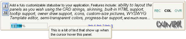 /* Copy and paste the following directives to your header file as it defines the namespace 'EXSTATUSBARLib' for the library: 'ExStatusBar 1.0 Control Library' #import "D:\\Exontrol\\ExStatusBar\\project\\Debug\\ExStatusBar.dll" using namespace EXSTATUSBARLib; */ EXSTATUSBARLib::IStatusBarPtr spStatusBar1 = GetDlgItem(IDC_STATUSBAR1)->GetControlUnknown(); spStatusBar1->BeginUpdate(); spStatusBar1->PutToolTipDelay(1); spStatusBar1->PutToolTipWidth(364); spStatusBar1->GetVisualAppearance()->Add(1,"c:\\exontrol\\images\\normal.ebn"); spStatusBar1->PutBackground(EXSTATUSBARLib::exToolTipAppearance,16777216); spStatusBar1->PutFormat(L"1"); EXSTATUSBARLib::IPanelPtr var_Panel = spStatusBar1->GetPanel(long(1)); var_Panel->PutText(L"This is a bit of text that should occurs when the cursor hovers the panel"); var_Panel->PutToolTipText(var_Panel->GetText()); var_Panel->PutToolTipTitle(L"Title"); var_Panel->PutAlignment(EXSTATUSBARLib::exAlignMiddleLeft); spStatusBar1->EndUpdate();The following C# sample shows "Can I change the default border of the tooltip, using your EBN files":