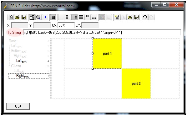 The Exontrol's eXButton WYSWYG Builder helps you to generate or view the EBN String Format, in the To String field as shown in the following screen shot: